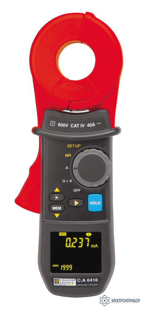 Измеритель сопротивления заземления — токовые клещи C.A 6416 являются представителями нового поколения измерителей сопротивления заземления и предназначены для оперативного контроля устройств заземления без их отключения и использования вспомогательных электродов. Данный прибор дает возможность производить точные измерения сопротивления заземления в диапазоне от 0,1 до 1500 Ом, а также измеряют ток и токи утечки в диапазоне от 1 мА до 40 А действ.