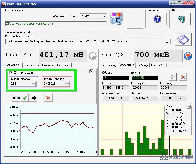 Программа AKTAKOM DMM_AM-1109_SW предназначена для ввода в компьютер, отображения, обработки и сохранения в файлы данных, полученных от цифрового двухканального мультиметра AKTAKOM AM-1109. Программа обеспечивает развитую статистическую обработку результатов измерений, сохранение данных в табличной форме и режим самописца. Программа имеет цветовую и голосовую сигнализацию (на английском языке).