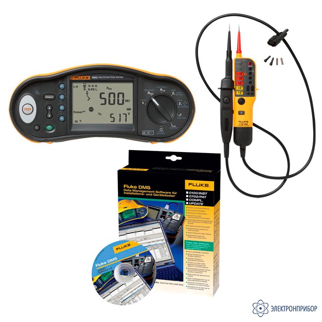 Комплект Fluke 1662/T110 KIT/D состоит из многофункционального тестера электроустановок Fluke 1662, пробника напряжения Fluke T110 и ПО Fluke DMS.