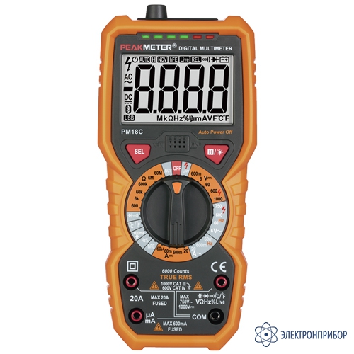 PM18C – это портативный многофункциональный цифровой мультиметр с функцией измерения среднеквадратического значения True RMS, оснащенный большим ЖК-дисплеем с задней подсветкой для удобства считывания показания, и фонарем. PM18C имеет функцию защиты от перегрузки и индикацию разряженной батареи. PM18C измеряет температуру с помощью термопары типа К в диапазоне от -20°C до +1000°C.