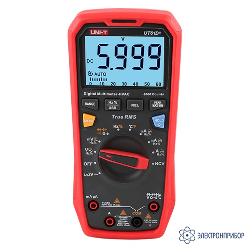 UT61D+ — портативный цифровой мультиметр с истинными среднеквадратичными значениями с высокой надежностью и безопасностью: 6000 отсчетов. Благодаря большому экрану, аналоговому дисплею с высоким разрешением, полномасштабной защите от перегрузки и уникальному внешнему виду он становится новым практичным электрическим измерителем. Измеритель может измерять напряжение / ток постоянного и переменного тока, сопротивление, диод, целостность цепи, емкость, частоту, коэффициент заполнения, температуру и прочее. Обеспечивая передачу данных, удержание данных, измерение относительных значений, измерение пиков, внутренняя сигнализация температуры, индикация низкого заряда батареи, подсветка, автоматическое отключение питания и функции NCV, измеритель является идеальным измерительным инструментом для многих областей применения.